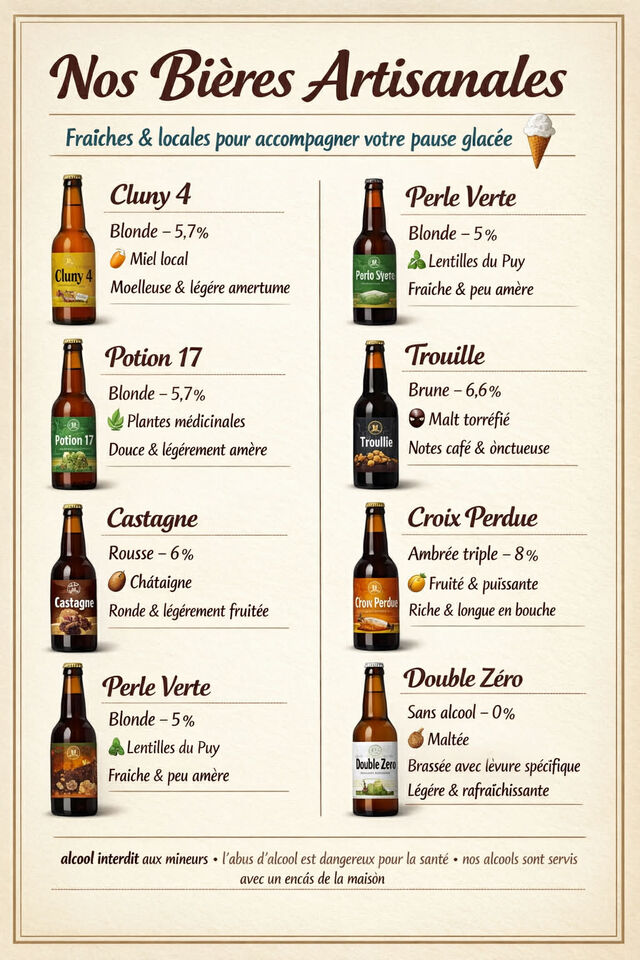 Lou Glacié de Vielo propose plus de 40 parfums de glaces artisanales, des boissons chaudes (thé, café, chocolat….), des boissons fraîches, bières, vins sur place ou à emporter, thé glacé maison, fleur de Jamaïque, crêpes, gaufres, tartes tatins, bonbons et tant de bonnes choses encore.